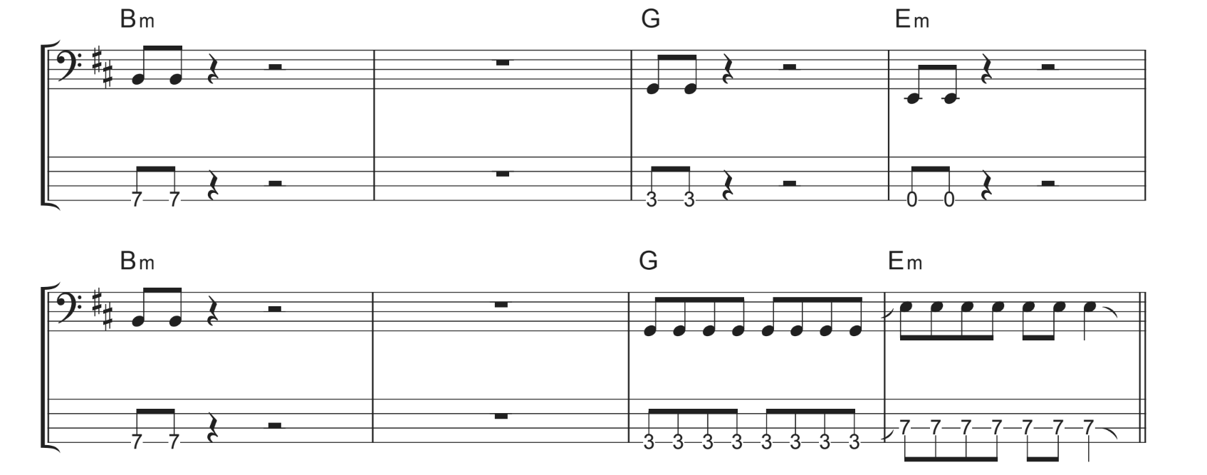 曲の勢いはもちろん、セクションごとの緩急がハッキリしているので、ベースが“押すところ”と“引くところ”を作れるとバンド全体が締まります。