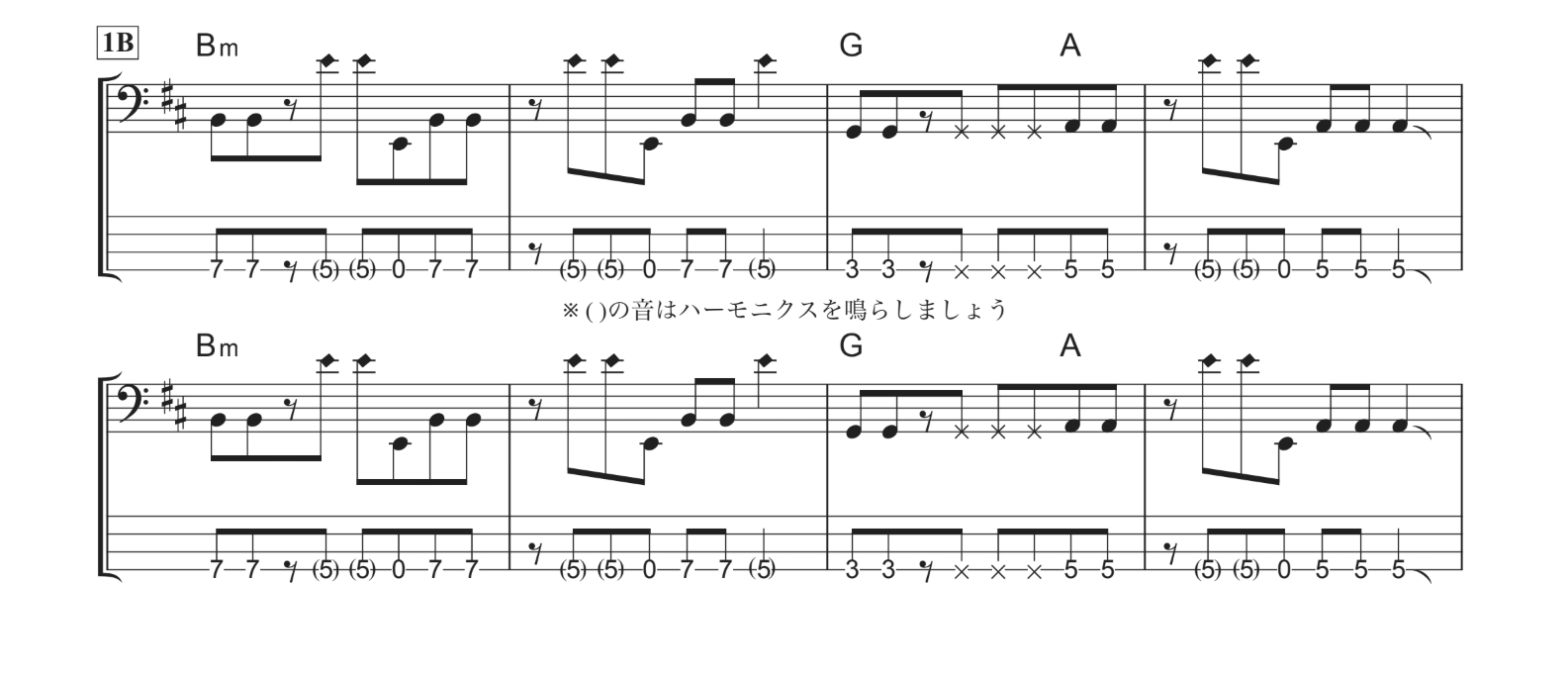 かっこ()で囲われているタブ譜の部分はハーモニクスを鳴らします