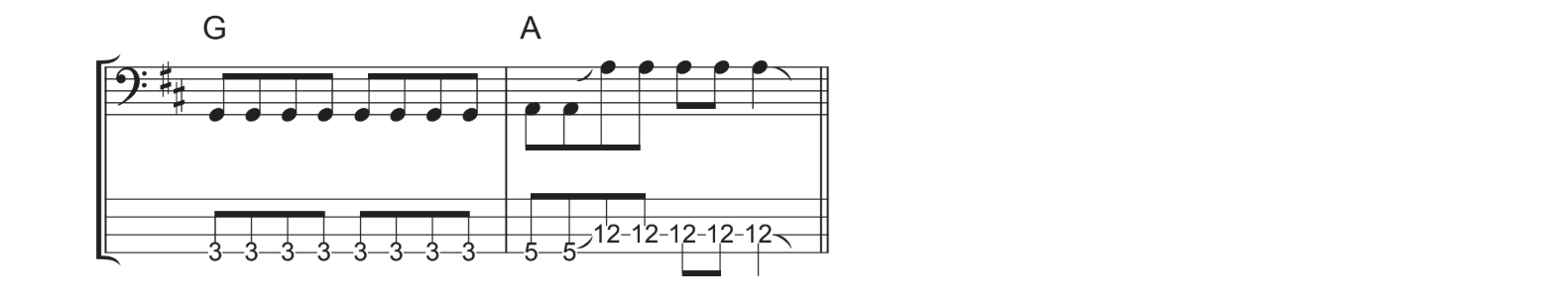 譜面上もルート中心で流れが追いやすく、コード表記があるので構成を理解しやすいのが嬉しいところ。さらに、サビなどで9〜12フレット、14フレット付近まで上がる場面があり、ポジション移動の基礎練習としても優秀です。