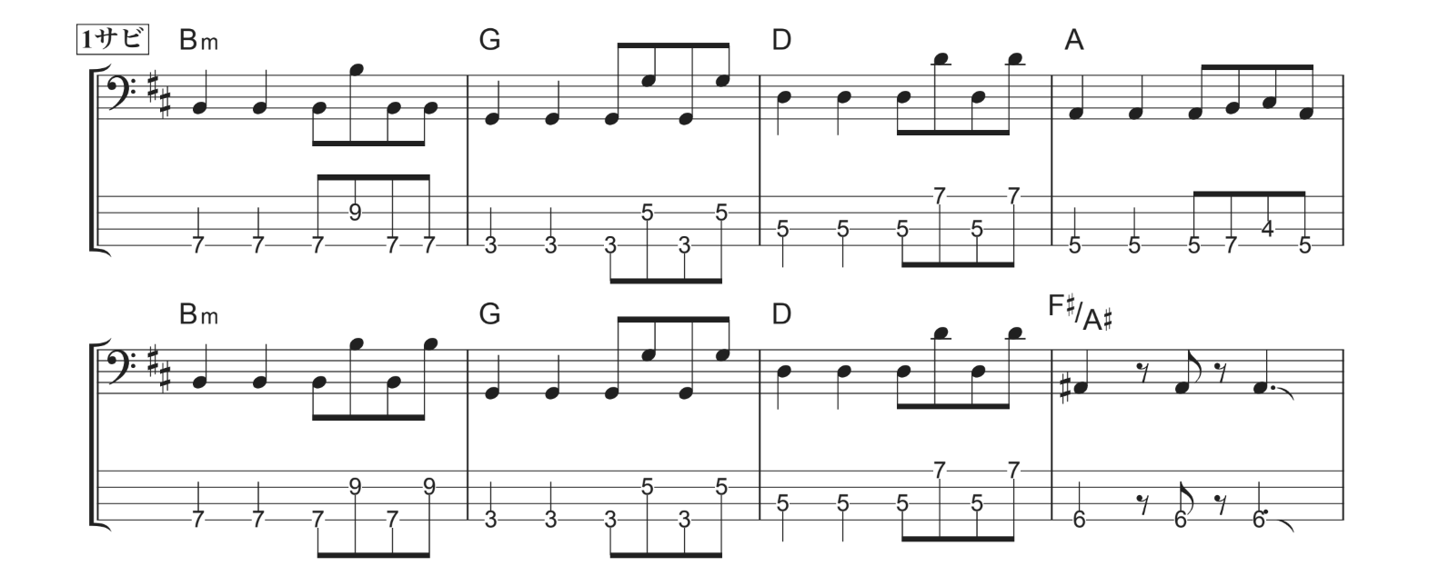 サビはオクターブ奏法を織り交ぜた8ビート系のベースラインです。